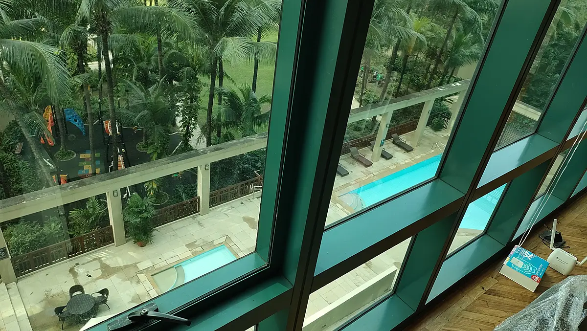「こちらです。」私は案内した。テクニシャンは窓を観察し、動かし、確認し、言った。「Sir, 上側、ヒンジ、壊れてる。明日コンストラクター送る。」この窓、本来下側しか開かない仕様のようだ。おぅおぅ、ぶっ壊れとるやないか。「オーケイ、ありがとうございます。」私は答えた。彼は何やら窓をガタガタ動かし、持ち前のテクニックでそれを元の位置に戻して閉めた。ワォ、グレイト。私は言った。テクニシャンはニコリ微笑んだ。